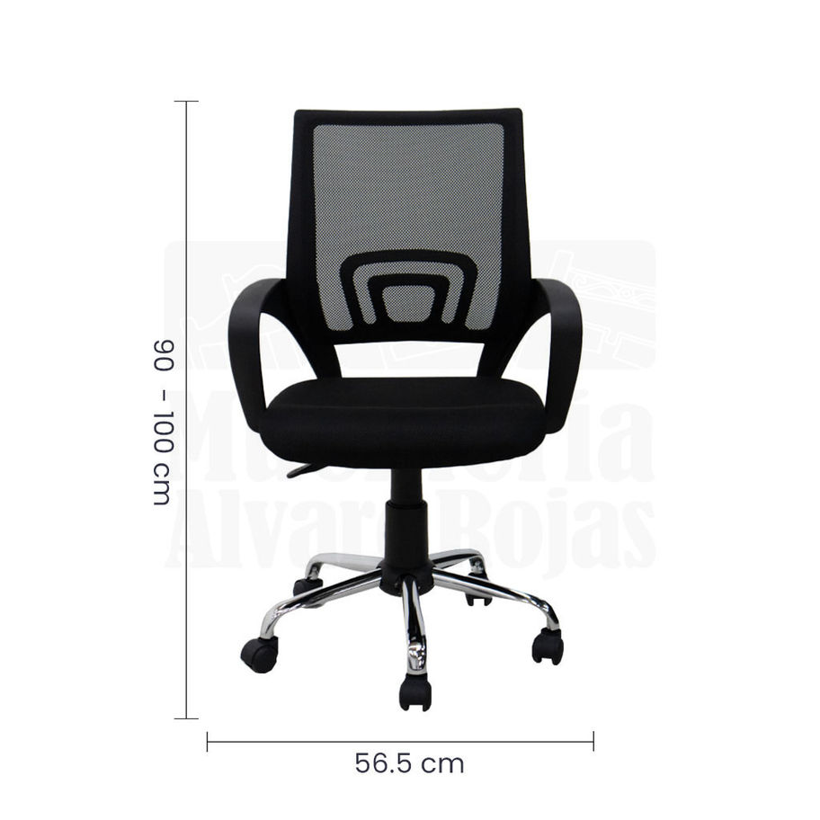 Silla semi-ejecutiva con malla negra, perfecta para oficinas y espacios de trabajo modernos. Con ajuste de altura de 91.5 cm a 101.5 cm, respaldo de 90 cm a 101.5 cm y un diseño ergonómico que garantiza comodidad. Medidas: 56.5 cm de frente y fondo. Ideal para largas jornadas laborales con estilo y confort."